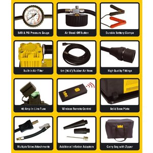 This awesome compressor delivers an incredible 110 Litres per minute free air delivery. It's equipped with all the standard features you’d expect in a compressor of this quality, including thermal overload & circuit breaker protection, as well as a premium wireless remote control. With the remote, you can start and stop the inflation process and get accurate tyre pressure readings without having to go back and forth to the compressor to continually turn it off and on.